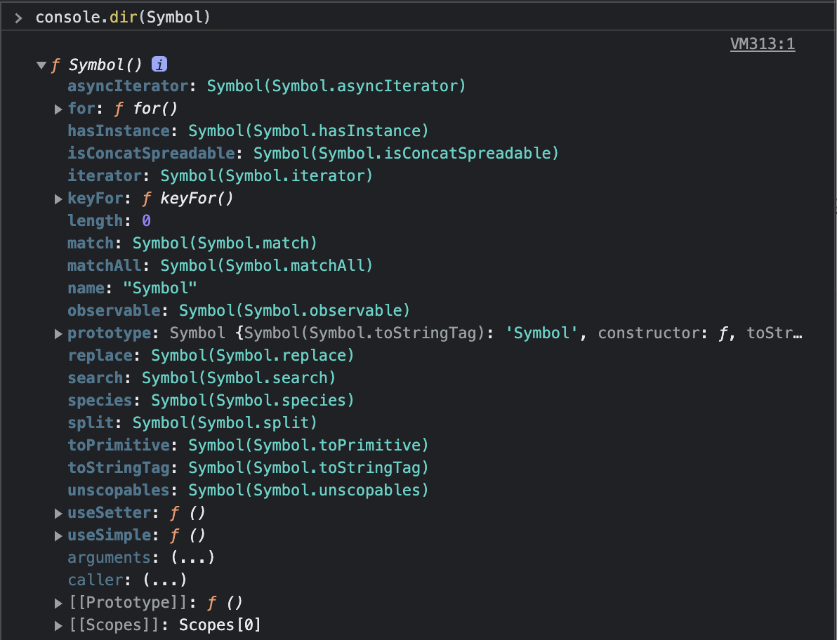 Symbol()함수로 Symbol 값을 생성할 수 있었다. 이것은 Symbol이 함수 객체라는 의미이다. 브라우저 콘솔에서 Symbol을 참조해 보자.