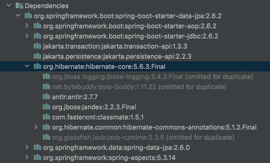 참고로 spring-booy-starter-data-jpa에는 hibernate관련 의존성이 들어있다. spring data jpa를 사용하는 경우 hibernate 관련 의존성을 추가하지 않아도 된다.