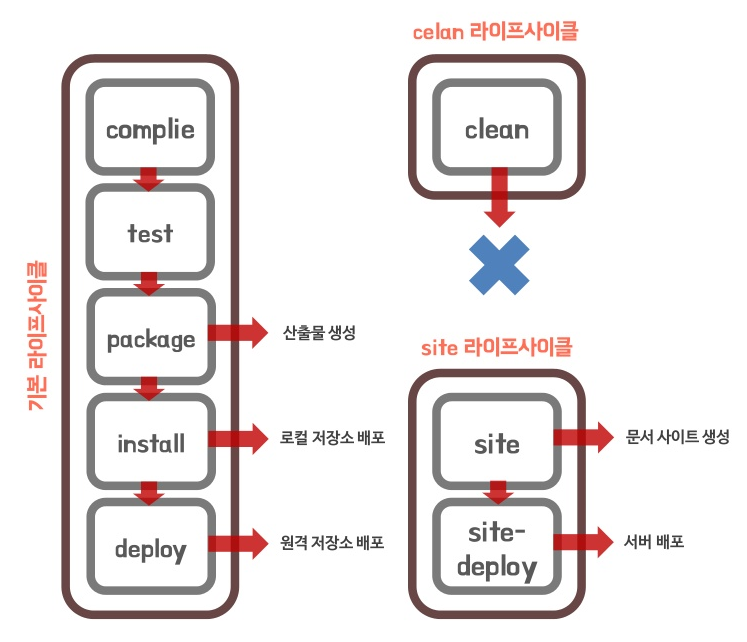 maven에는 라이프 사이클이 존재한다. default, clean, site 라이프 사이클로 나누고 세부적으로 phase(페이즈)가 있다.