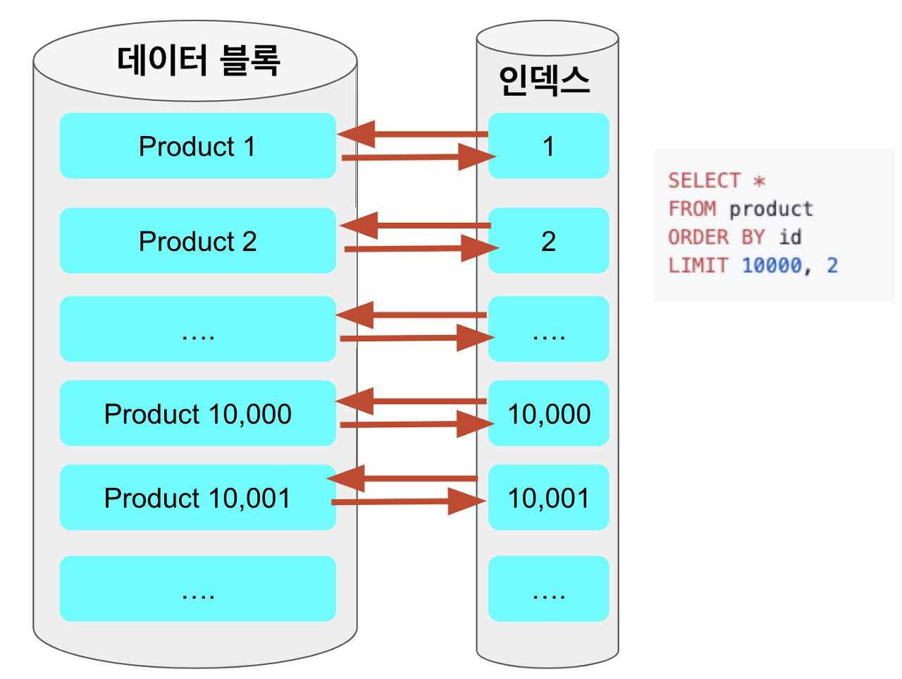 커버링 인덱스를 태우지 않은 일반 조회 쿼리는 order by, offset ~ limit 을 수행할 때도 데이터 블록으로 접근을 하게 된다.
