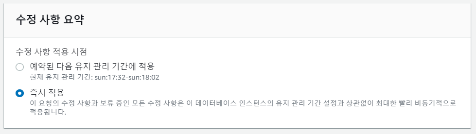 [즉시 적용]으로 변경 후 [DB 인스턴스 수정] 버튼 클릭