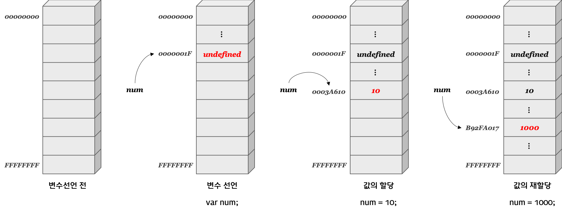 변수는 값의 위치(주소)를 기억하는 저장소이다. 값의 위치란 값이 위치하고 있는 메모리 상의 주소(address)를 의미한다. 즉, 변수란 값이 위치하고 있는 메모리 주소(Memory address)에 접근하기 위해 사람이 이해할 수 있는 언어로 명명한 식별자(identifier)이다.