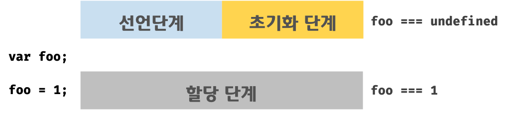 앞에서 살펴본 예제를 호이스팅 관점에서 다시 보면 1이 실행되기 이전에 var foo = 123; 이 호이스팅 되어 1 구문 앞에 var foo; 가 옮겨진다. 하지만 변수 선언 단계와 초기화 단계가 할당 단계와 분리되어 진행되기 때문에 이 단계에서는 foo에는 undefined가 할당되어 있다. 변수 foo에 값이 할당되는 것은 2행에서 실행된다.
